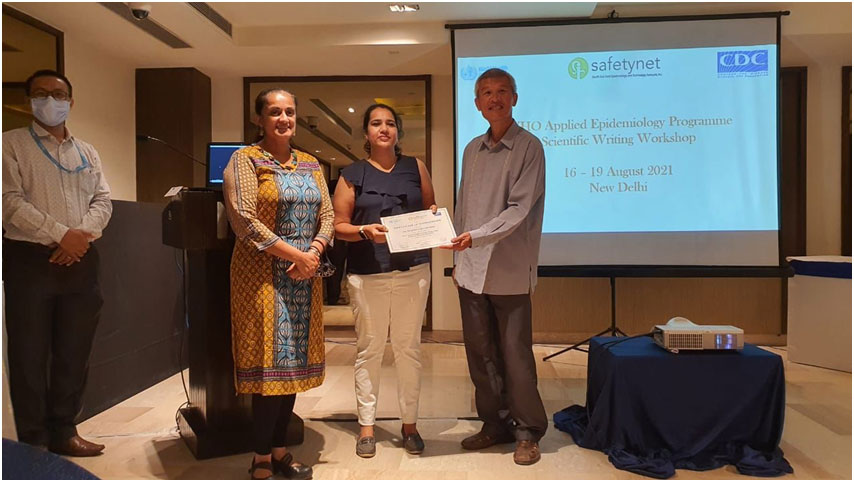 Dr Sujatha Vijayakumar felicitated for acting as a writing coach for the WHO-AEP officers, 2021. Also seen are Dr Kevi, WHO- India, Dr Meghna Desai, Director, CDC – India.